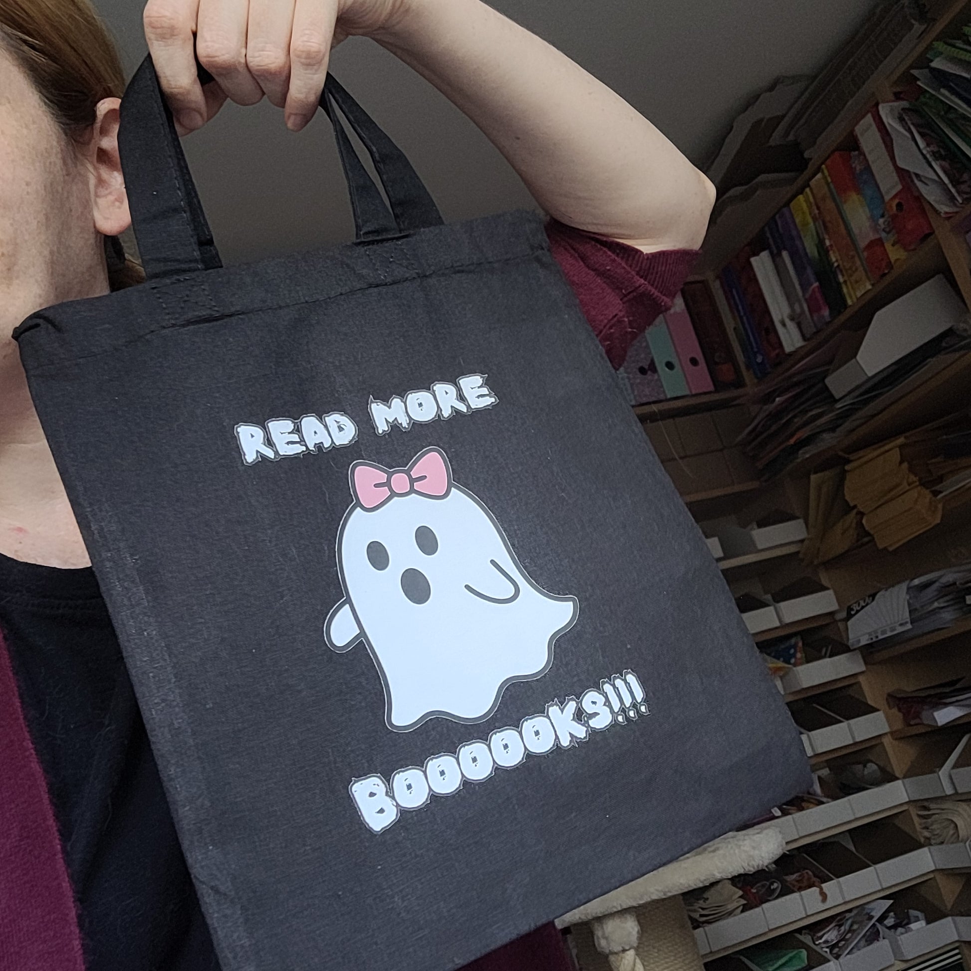 Sorge für ein bisschen Spukspaß beim Büchertransport: Mit Sookie, dem Geistermädchen, hast du die perfekte Begleiterin für alle Leseabenteuer! 💕 Der schwarze Buchbeutel aus robuster Baumwolle wurde mit hochwertiger DTF-Folie bebügelt und zeigt Sookie umgeben vom frechen Schriftzug: „Read more BOOOOOKS!!!“ - ein Aufruf, dem sich jeder Bücherfreund nur zu gern anschließt. 🎀✨