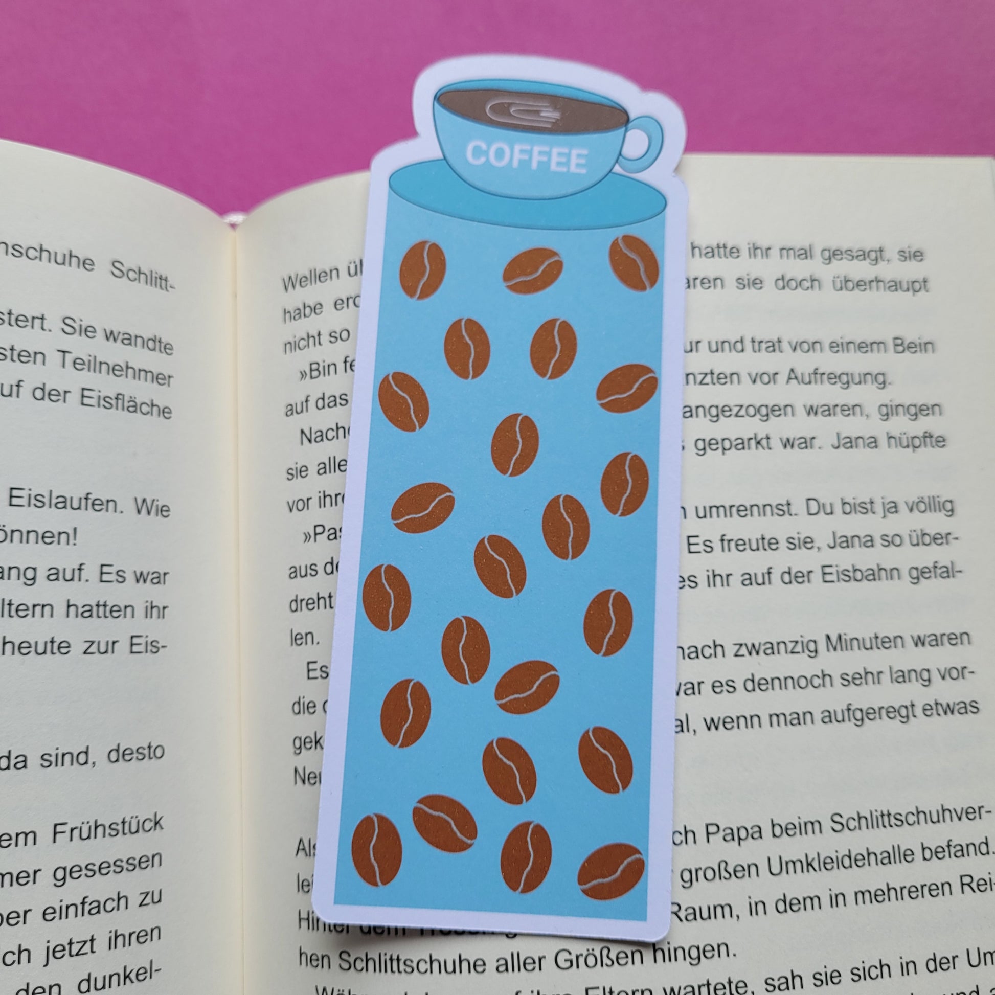 Dieses besondere Lesezeichen bringt beides zusammen: Mit der ausgestanzten Kaffeetasse an der oberen Kante ist es nicht nur praktisch, sondern auch ein echter Hingucker. Die Vorderseite ziert ein fröhliches Muster aus Kaffeebohnen, das sofort Lust auf eine gemütliche Lesepause macht.