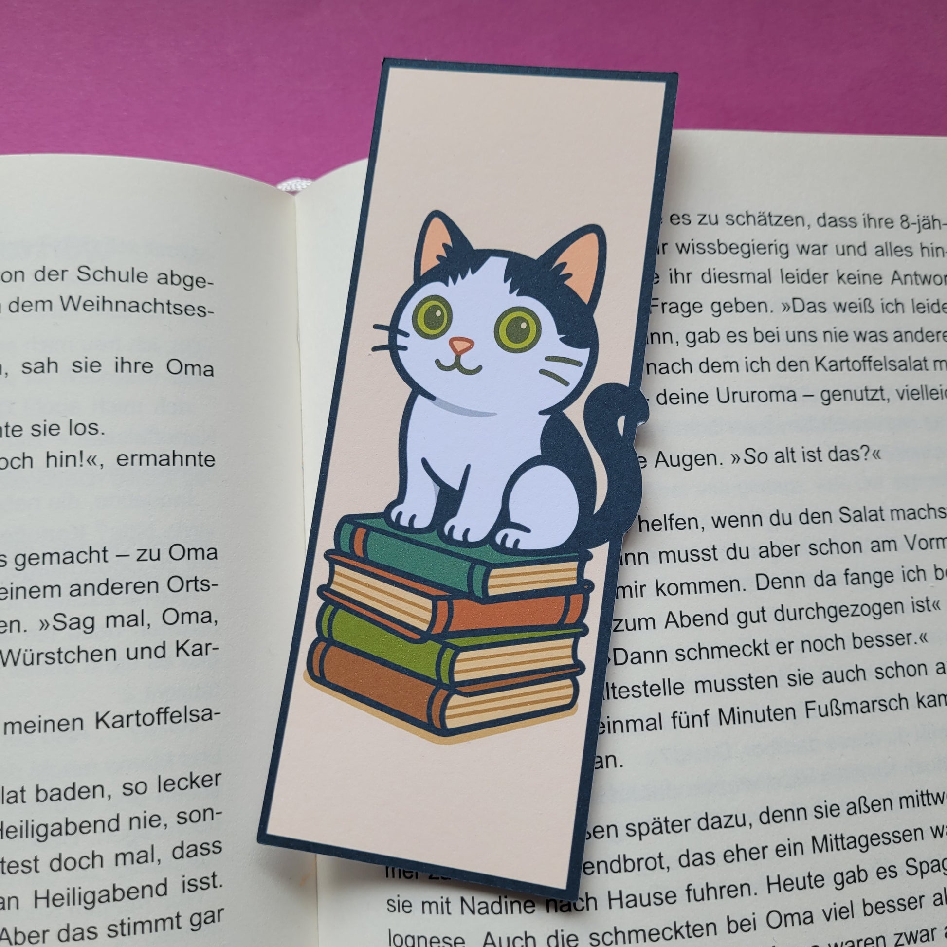 Auf den ersten Blick wirkt es wie ein klassisches Lesezeichen - doch beim genaueren Hinsehen zeigt sich das kleine Extra: Katze Mia hockt entspannt auf einem Bücherstapel, und ihr Schweif ragt spielerisch über den Rand hinaus. So schleicht sie sich in jedes Buch und macht es sich zwischen deinen Seiten gemütlich.