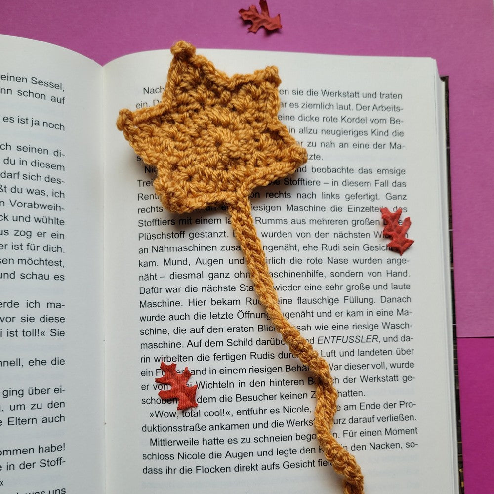 Das Ahornblatt ist in einem hellen Braunton gehäkelt und erinnert an Spaziergänge durch buntes Laub, klare Herbstluft und Bücher, die perfekt zu dieser Jahreszeit passen. Es liegt flach zwischen den Seiten und markiert zuverlässig deine aktuelle Lesestelle - ganz ohne Eselsohren.
