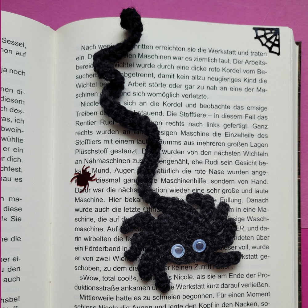 Dieses gehäkelte Spinnen-Lesezeichen krabbelt sich mit einem Augenzwinkern zwischen die Buchseiten. Aus schwarzer Wolle gefertigt und mit zwei Wackelaugen versehen, ist sie eher charmant als gruselig - perfekt für alle, die Halloween mögen oder einfach Spaß an außergewöhnlichen Lesezeichen haben.