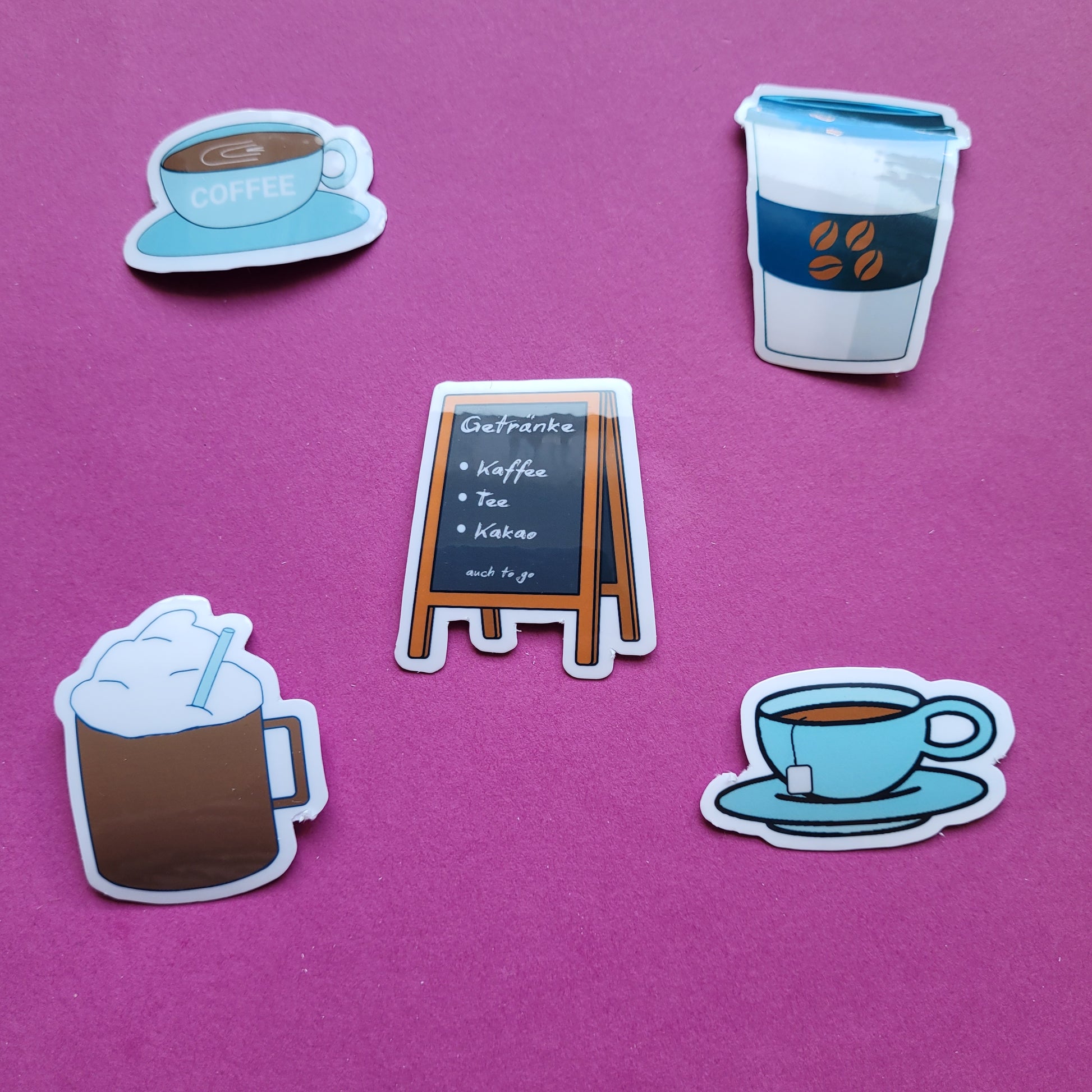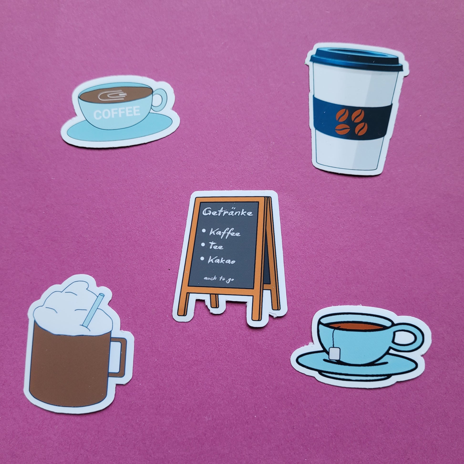 Wähle deinen Favoriten einzeln oder hol dir das komplette Getränke-Set zum Vorteilspreis. Alle Motive sind auf hochwertiger Vinylfolie gedruckt und wahlweise matt oder glänzend laminiert – perfekt für Journals, Planer, Briefe oder deinen Laptop.