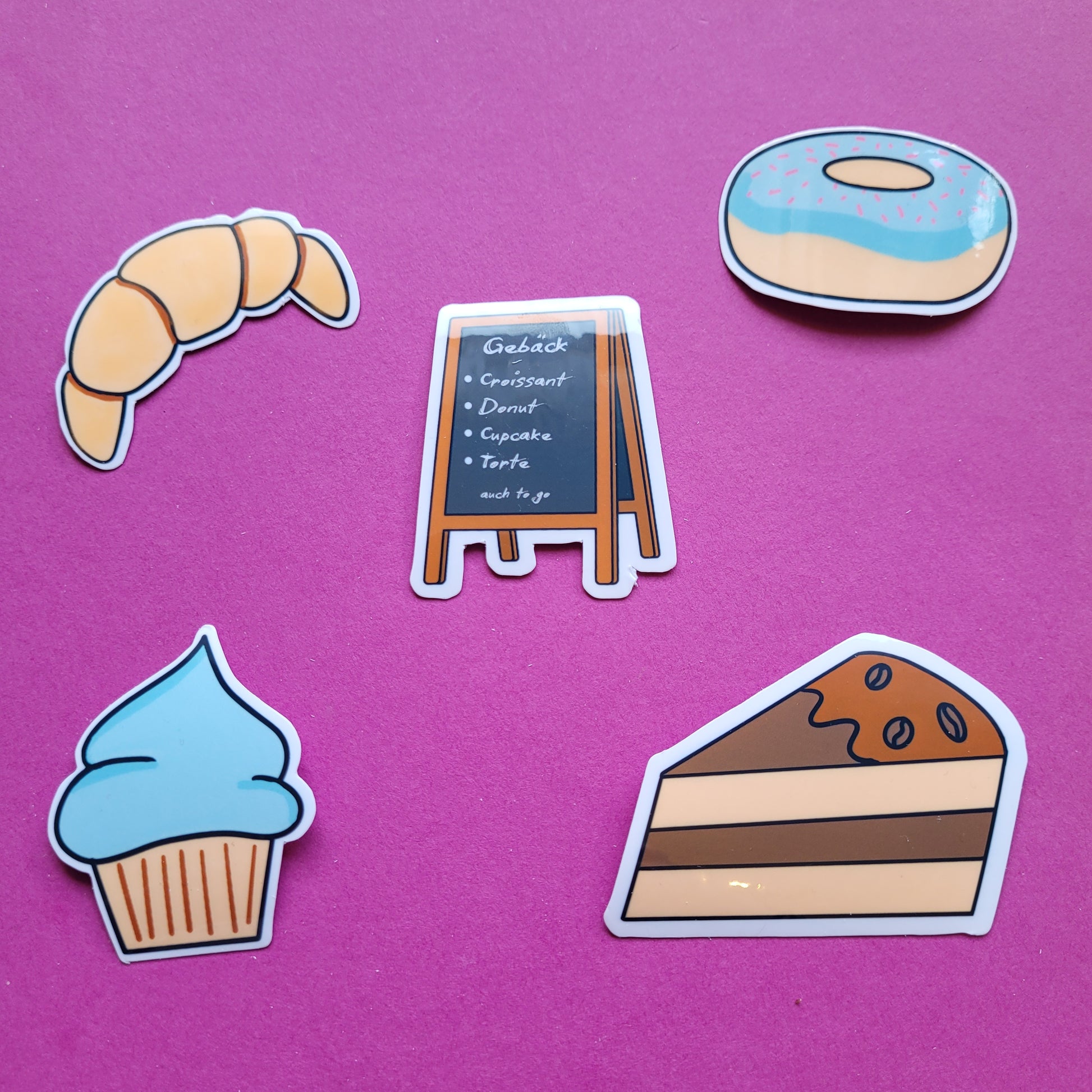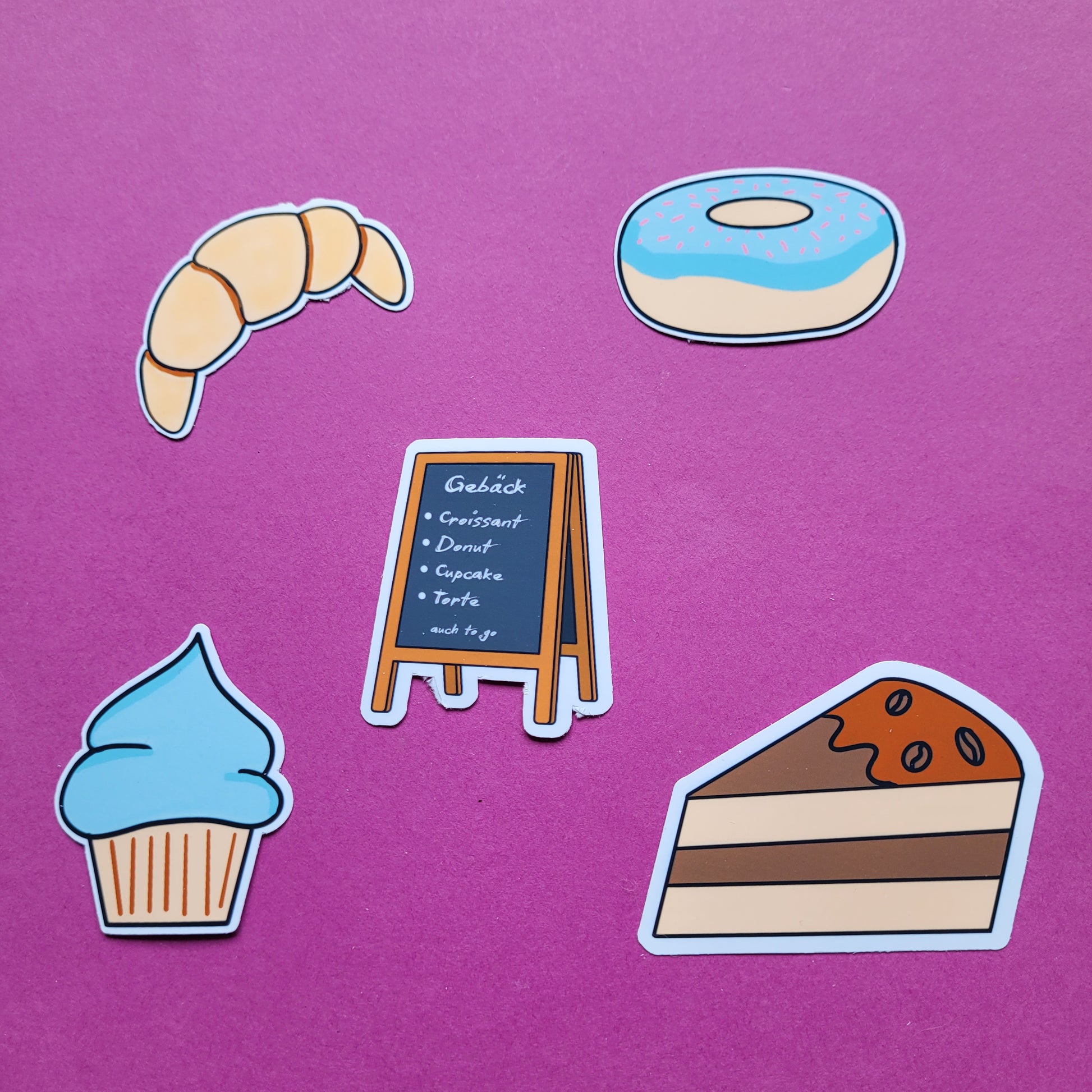 Die Sticker sind einzeln oder als komplettes Gebäck-Set erhältlich – und du hast die Wahl zwischen matt oder glänzender Laminierung auf hochwertiger Vinylfolie.